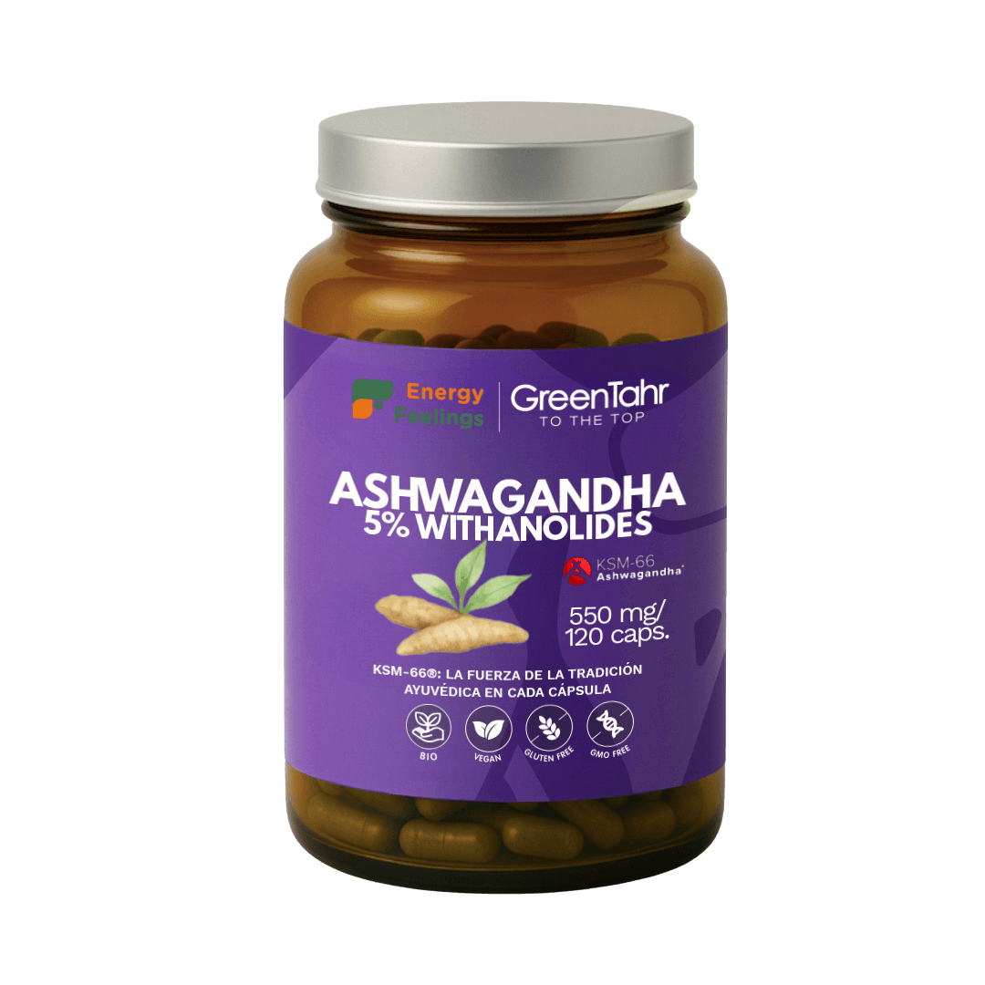 • Aporta 550 mg de extracto de raíz de Ashwagandha KSM-66® por dosis diaria (1 cápsula), con 5% de withanólidos (27,5 mg).