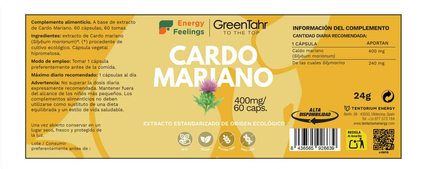 • Aporta 400 mg de extracto seco de cardo mariano (Silybum marianum) por dosis diaria (1 cápsula), con 60% de silimarina (240 mg).