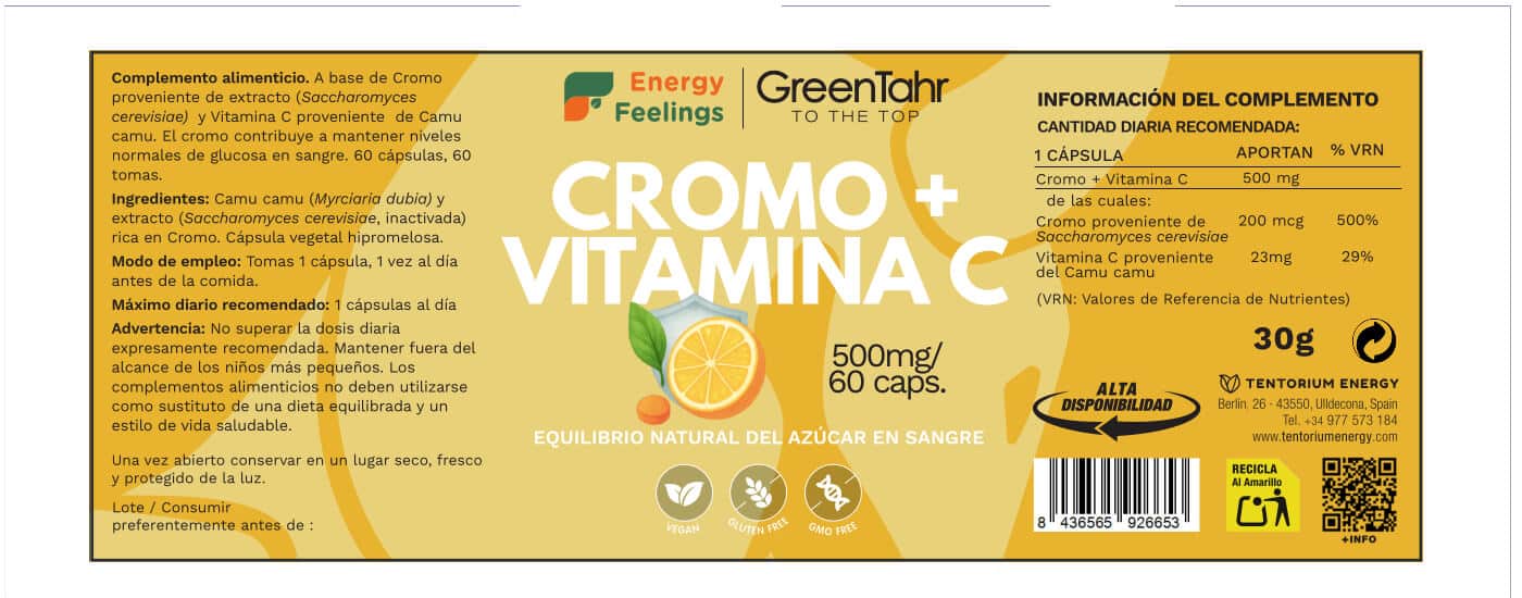 • Aporta 280 mcg de cromo (500% VRN) y 23 mg de vitamina C natural (29% VRN) por dosis diaria.