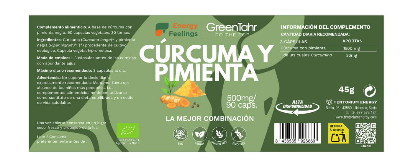 • Aporta 1.500 mg de mezcla ecológica de cúrcuma y pimienta negra por dosis diaria (3 cápsulas), con 30 mg de curcumina.