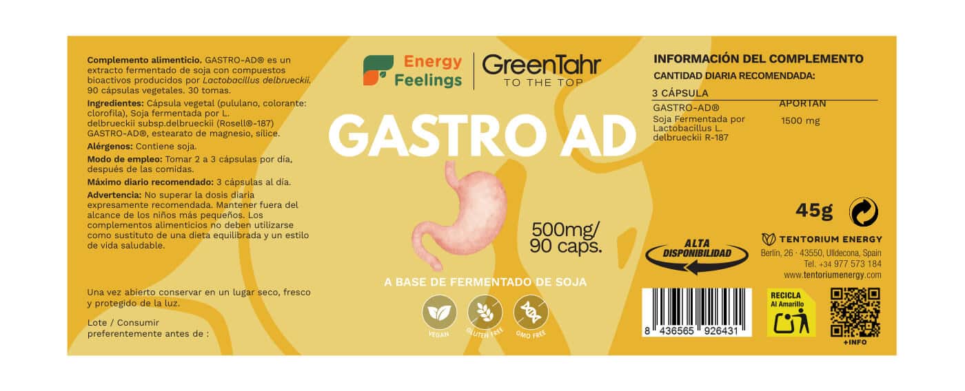 • Aporta 1.500 mg de fórmula simbiótica con GASTRO-AD® (Rosell®-187) por dosis diaria (3 cápsulas), con probióticos activos de alta estabilidad.